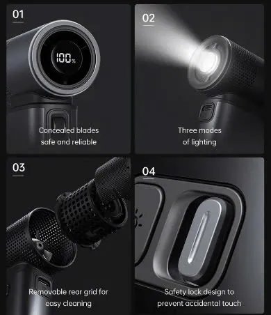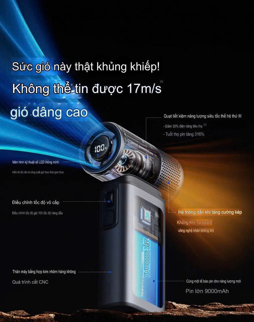 Quạt được hoàn thiện từ hợp kim nhôm cao cấp, mang đến vẻ ngoài bóng bẩy và hiện đại. Điểm nhấn thiết kế nằm ở núm xoay dạng con lăn tinh tế giống bánh xe chuột máy tính, giúp dễ dàng điều chỉnh tốc độ chính xác cùng màn hình LED trực quan hiển thị dữ liệu tốc độ và pin trong thời gian thực. Ngoài ra, sản phẩm còn tích hợp đèn LED màu xanh tạo hiệu ứng bắt mắt, phù hợp với phong cách công nghệ cao.